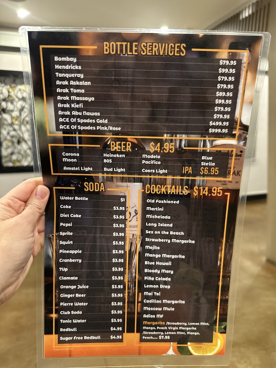 - Soft Drinks and Beverages: A selection of sodas, bottled juices, water, tea, coffee including Turkish coffee, energy drinks, and specialty cocktails like the Mai Tai, crafted by an in-house mixologist.
