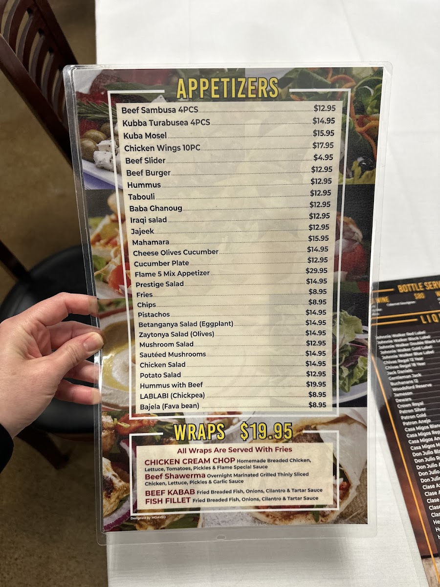 - Appetizers: A variety of small plates and starters including salads such as Fattoush and Tabouli, dips like Baba Ghounsh and Hummus with Pita Bread, as well as items like Chicken Wings, Ceviche Salad, and Beef Sambousk. These dishes are suited for sharing or light bites.