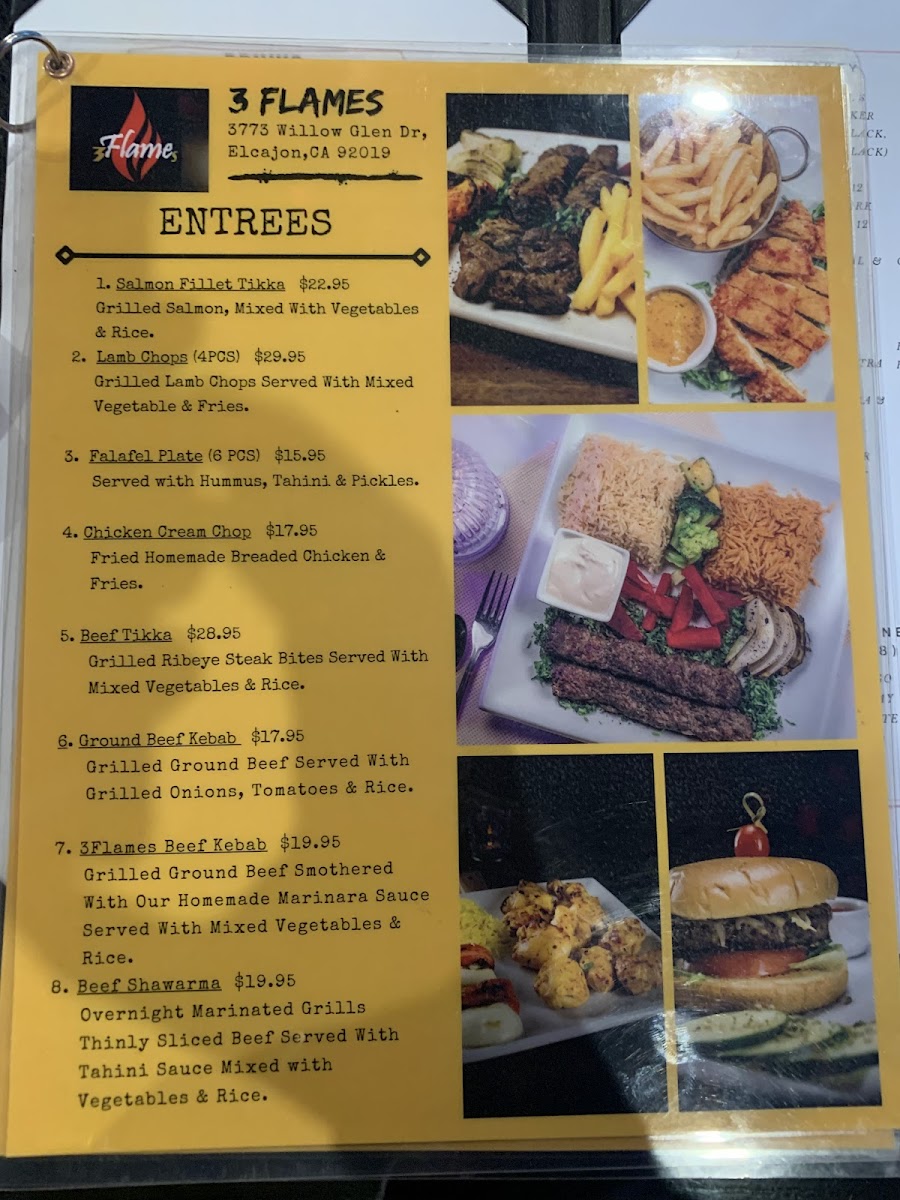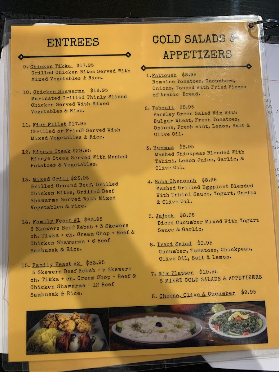 - Entrées: Larger main courses featuring grilled and roasted meats such as Lamb Chops, Ribeye Tikka, Chicken Tikka and Shawarma plates, Beef Kabob, Fish Fillet, and a Mixed Grill platter. The menu also includes vegetarian options like the Falafel Plate. Family-sized feast options are available for group dining.
