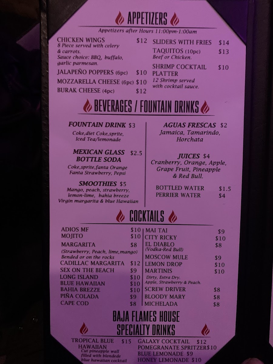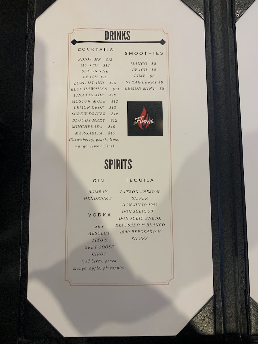 The menu at Flame Bar & Grill offers a diverse selection of dishes and beverages typical of a bar and grill establishment with Mediterranean influences. It is organized into several main categories to cater to various dining preferences.